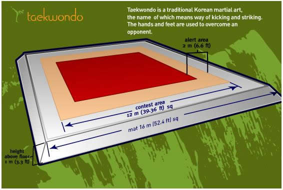 The competition area comprises two contest areas measuring 14m x 14m each, including the attention area, covered with an elastic mat, installed on a podium 0.5m high.