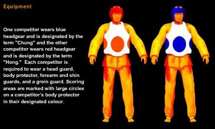 All contestants must wear a taekwondo uniform (dobok) and protectors recognised by the WTF. Before entering the contest area, contestants should be wearing the following: