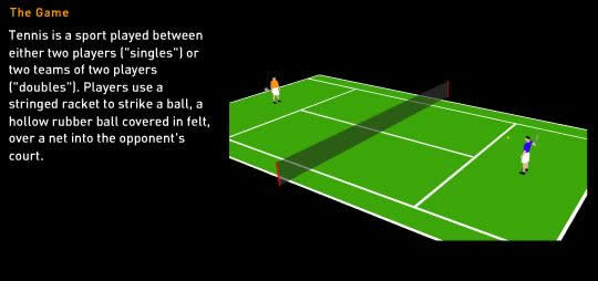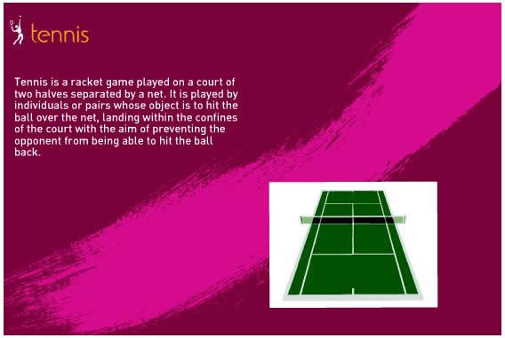 Tennis is played on a rectangular flat surface, usually of grass, clay, or concrete (hard court). The court is 78ft (23.77m) long, and its width is 27ft (8.23m) for singles matches and 36ft (10.97m) for doubles.