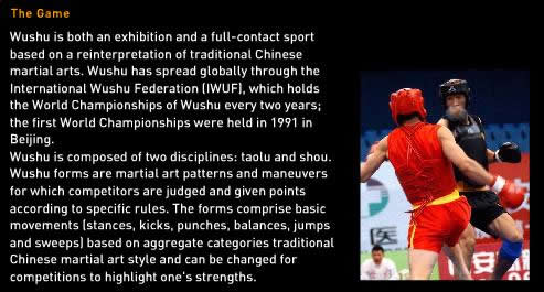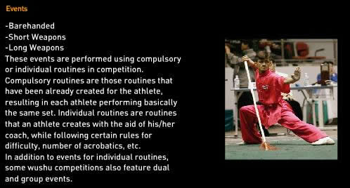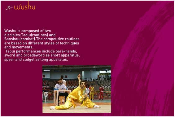 Wushu, the Chinese word meaning "martial art", originated in China and is composed of two disciplines: taolu (routines) and sanshou (combat). The competitive routines are based on different styles of techniques and movements.