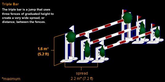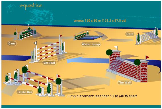 Riders are required to guide their mount over a course of up to 14 obstacles that are laid out inside an earth covered arena. Obstacles can include triple bars, parallel rails, water jumps and simulated stone walls. Jumping tests the horse's leaping ability and the rider's skill to urge the horse over challenging obstacles.