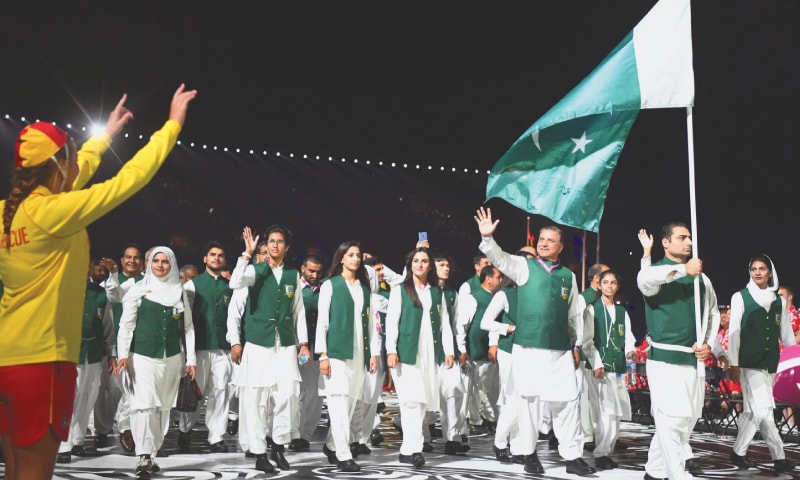 Pakistan’s Weightlifter Usman Amjad Rathore led the Pakistani Contingent during the Opening Ceremony. He is followed by Chef-de-Mission Lt.Gen (Retd) Muzammil Hussain, other officials and athletes.
