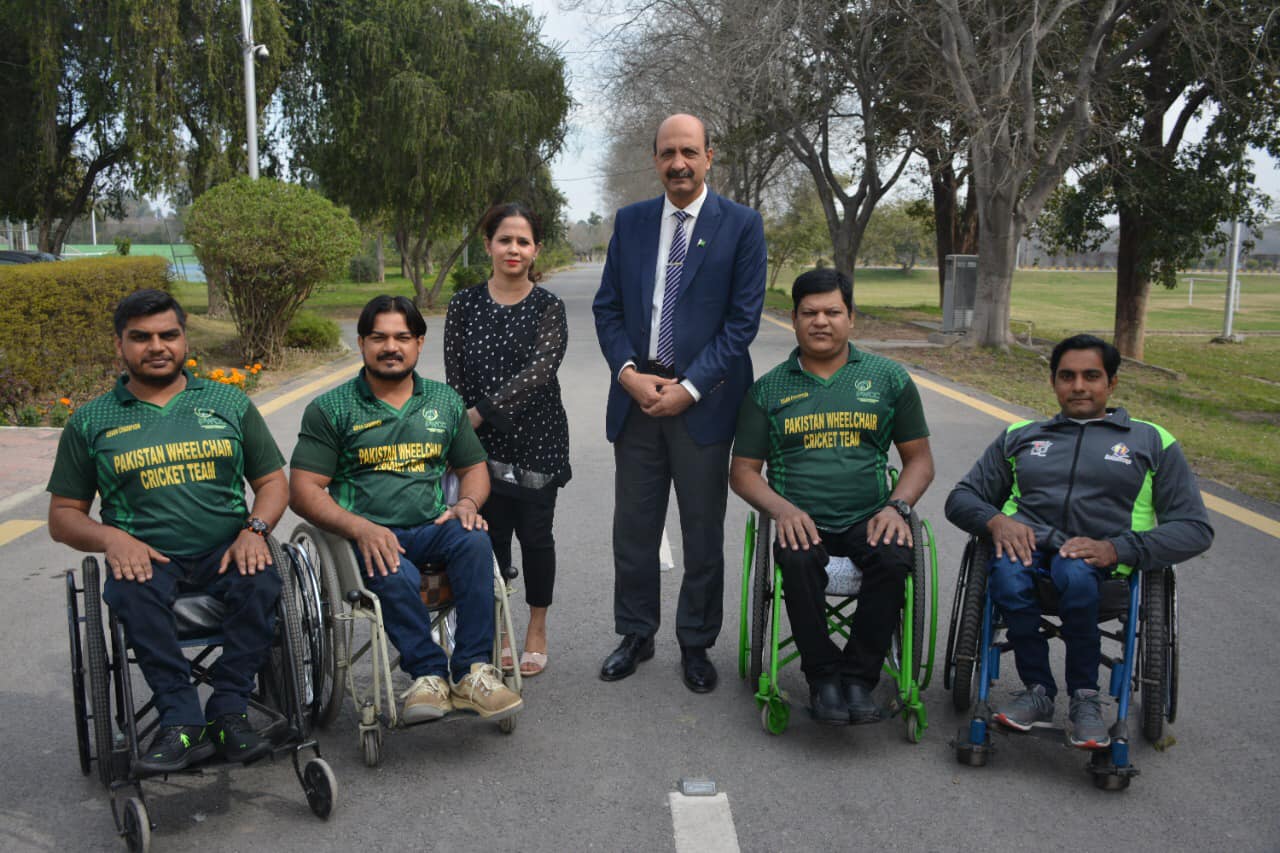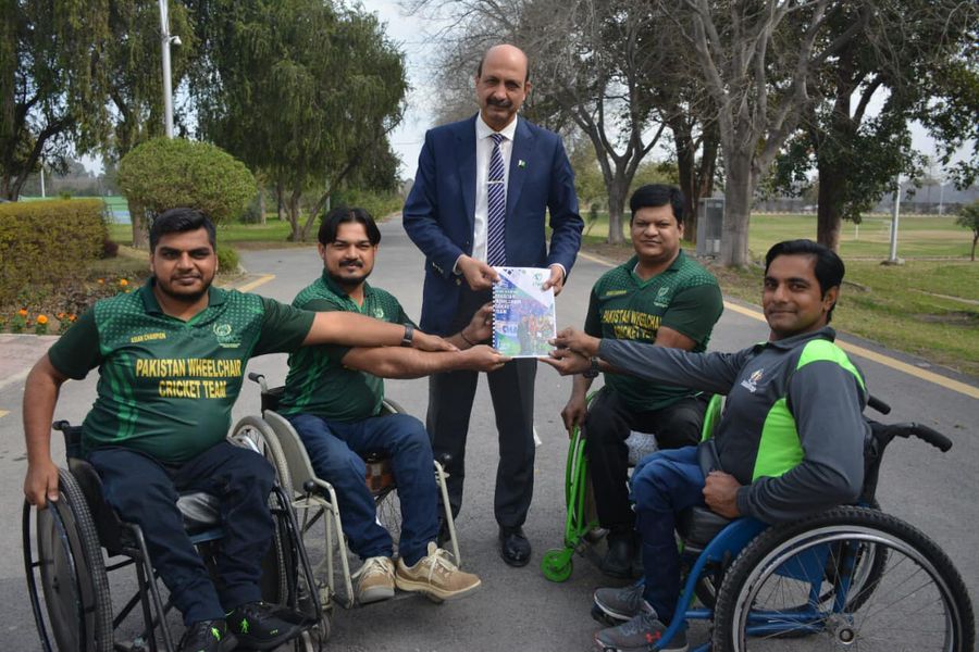 DG, PSB Col (R) Muhammad Asif Zaman receiving souvenirs from Rukhsana Rajput, Chief, Pakistan Wheelchair Cricket Team. Mohammad Zeeshan (Captain), Sajid Ali Mohammad Omar and Arsalan are also in the group photo.