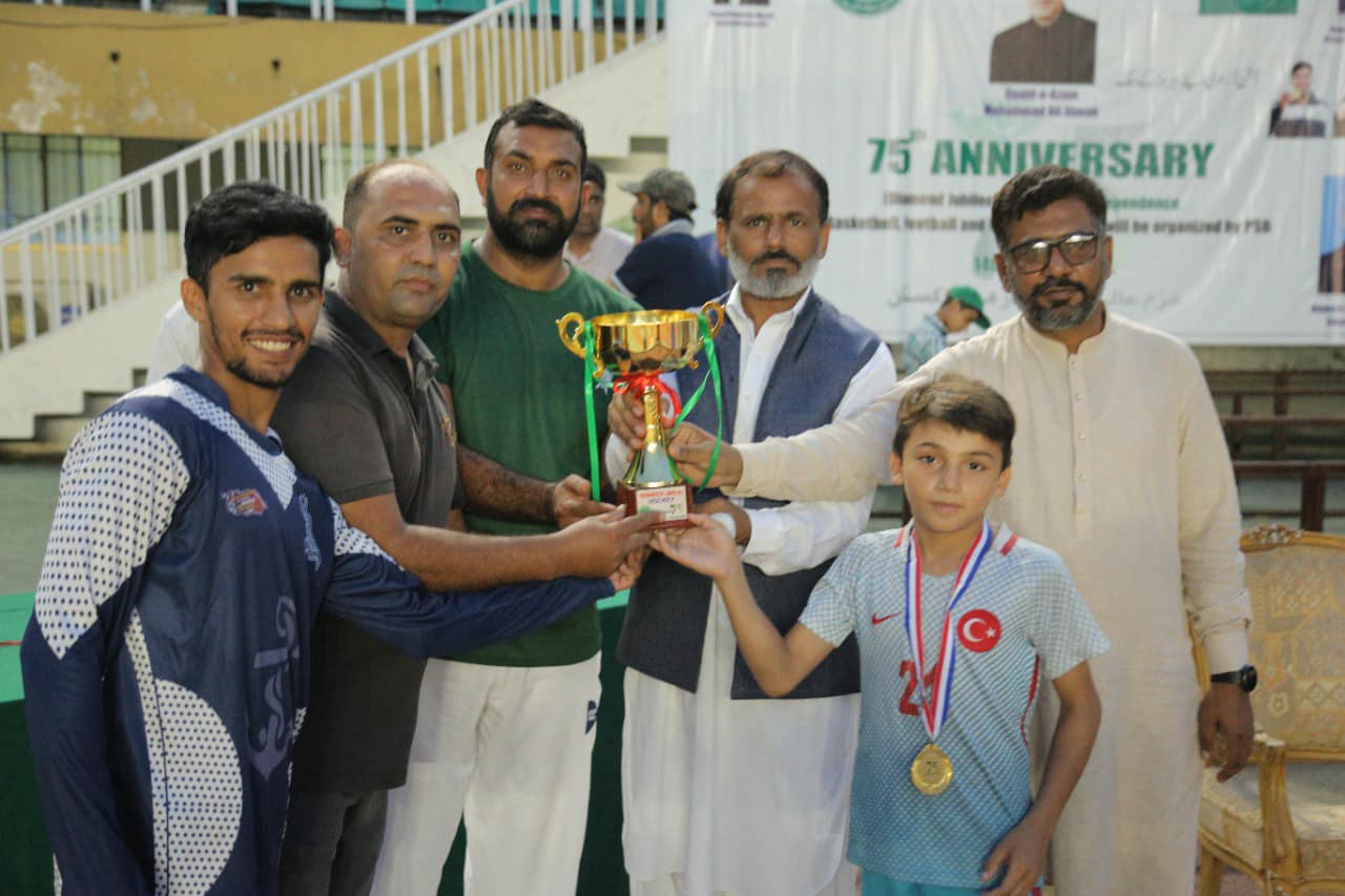 Trophies being presented by PSB officials to winners and runner-ups of 75th Independence Day Football, Hockey and Basketball matches.